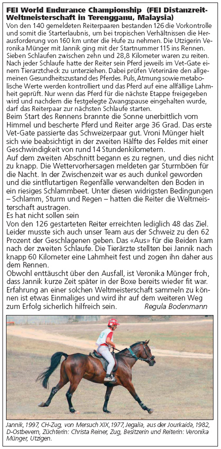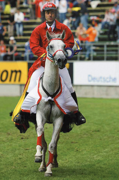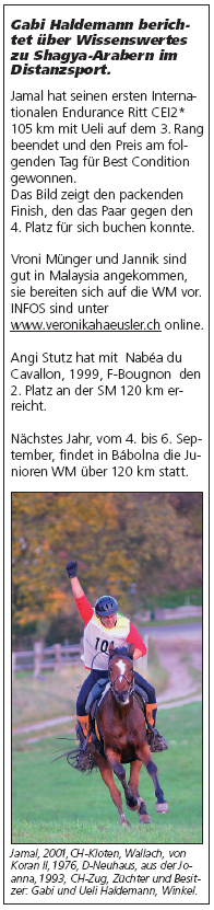 Siglavy Bagdady VIII-1 wurde 1998 in Bábolna geboren und im Jahre 2004 nach Spanien verkauft, wo der Wallach für die Distanzreiterei trainiert wurde. Aber schon in Bábolna war «Hungares», wie er in Spanien genannt wird, der «special training-education method» unterzogen worden. Überaus interessant ist das Studium des Pedigrees von Siglavy Bagdady VIII-1. In der vierten Generation sind nur vier Vollblutaraber der 16 Ahnen zu finden und im Pedigree der Mutter ist der Grossvater von Bajar, Sultan, vier mal aufgeführt. Und da gibt es allen Ernstes noch sogenannte Kenner der Rasse, die behaupten, der Shagya-Araberrasse würde ein bisschen fremdes Blut gut tun! Wenn es noch eines Beweises der Härte des Shagya-Araber bedurft hätte, so hat die Leistung dieses Siglavy Bagdady dies nachhaltig dokumentiert. Untermauert werden diese Weltmeisterehren auch mit noch vielen weiteren überragenden Leistungen anderer Shagyas aus ganz Europa in der Distanzreiterei. So bleibt uns denn nur noch, dem Wallach Siglavy Bagdady VIII-1, dem Gestüt Bábolna seinem Züchter sowie seinem Reiter Miguel Vila Ubach ganz herzlich zum Weltmeistertitel zu gratulieren. (bf)